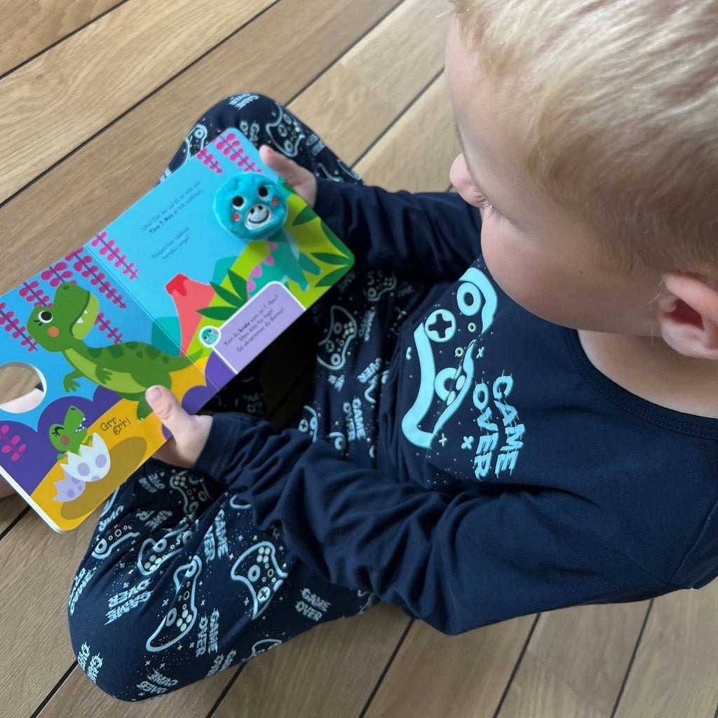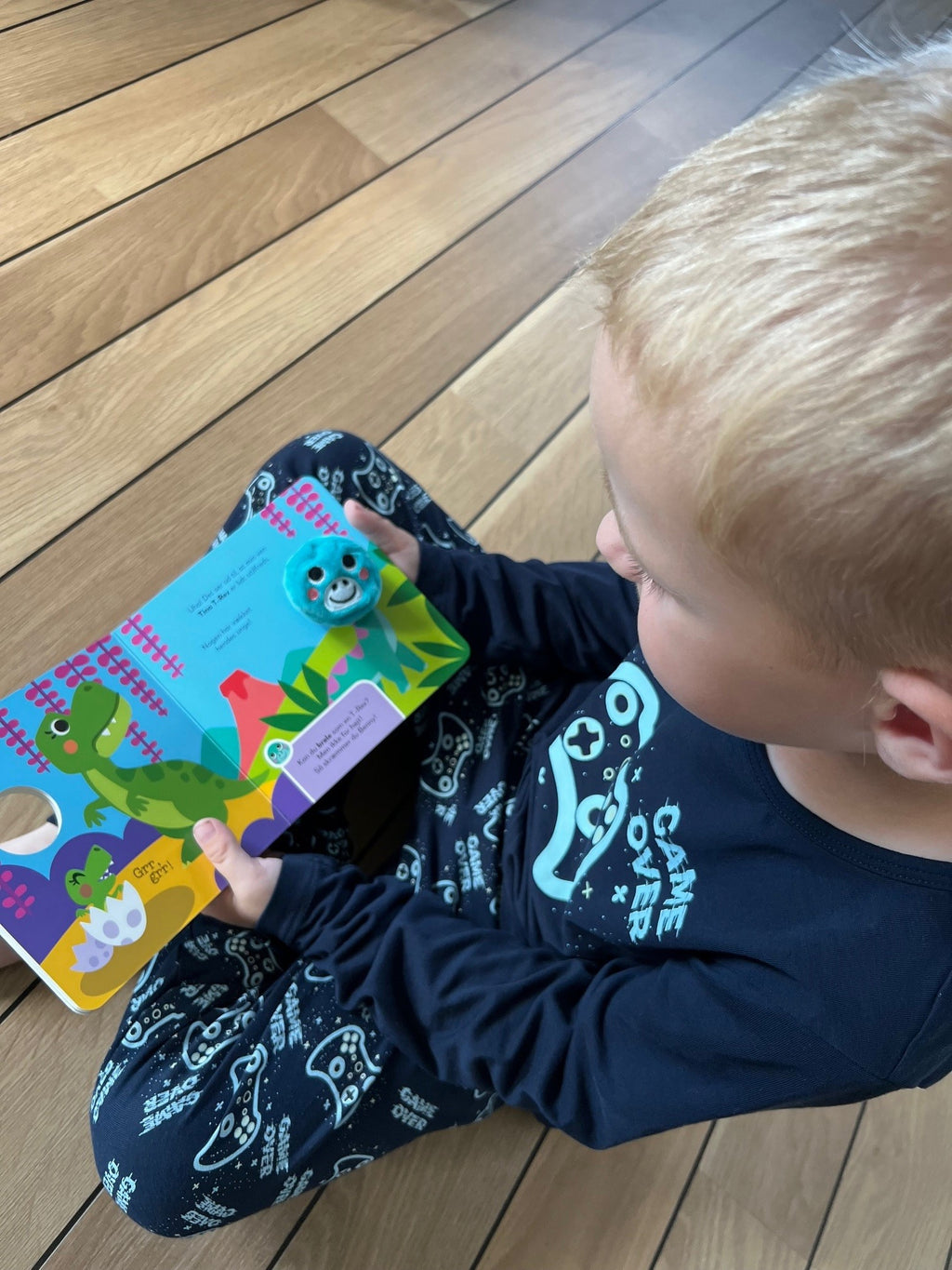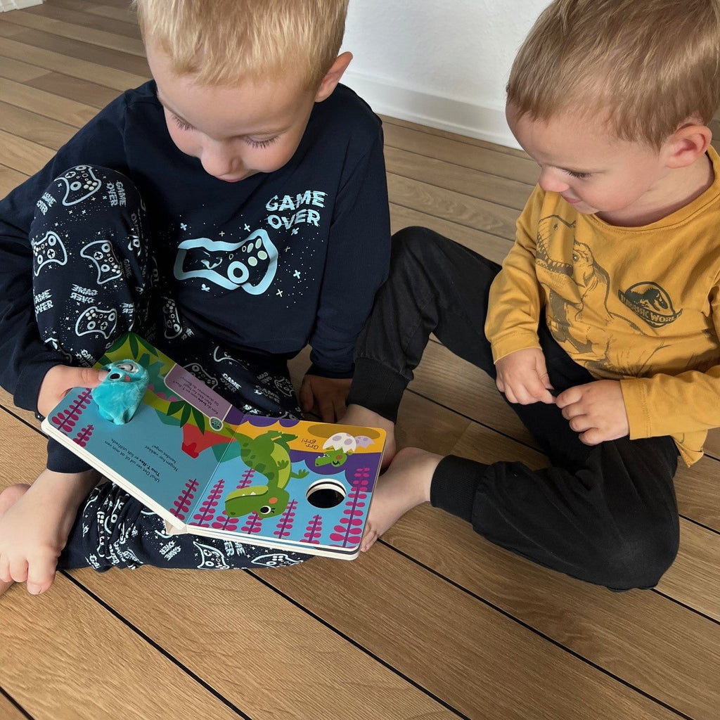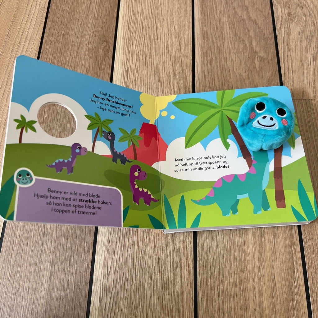 Kom med fingerdukken Benny på tur i dinosaurernes verden! Tag børnene med på en spændende rejse tilbage i tiden sammen med Benny og hans dinosaurvenner. Bogen introducerer de mindste til forskellige dinosaurer på en sjov og tryg måde - oplagt til sprogstimulering. Den indbyggede fingerdukke vækker fortællingen til live og inviterer til interaktiv leg og læring i børnehøjde.