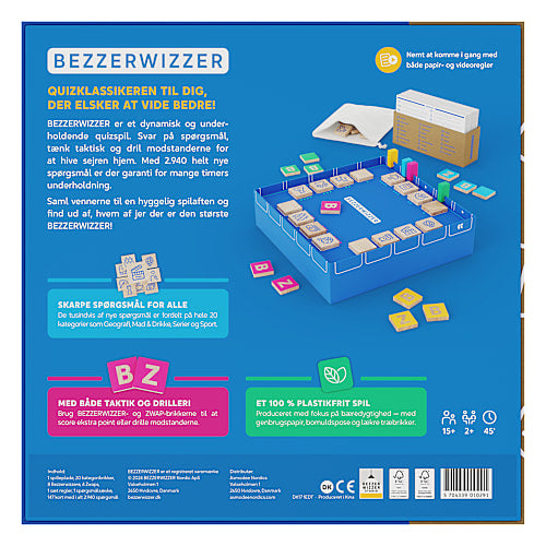 Det populære BEZZERWIZZER er nu 100 % plastikfrit og lavet i miljøvenlige materialer som træ og genbrugspapir - naturligvis uden at gå på kompromis med den høje kvalitet og unikke spiloplevelse, som BEZZERWIZZER er kendt for. Med 2.940 nye og interessante spørgsmål inden for 20 opdaterede kategorier er der som altid noget for enhver.