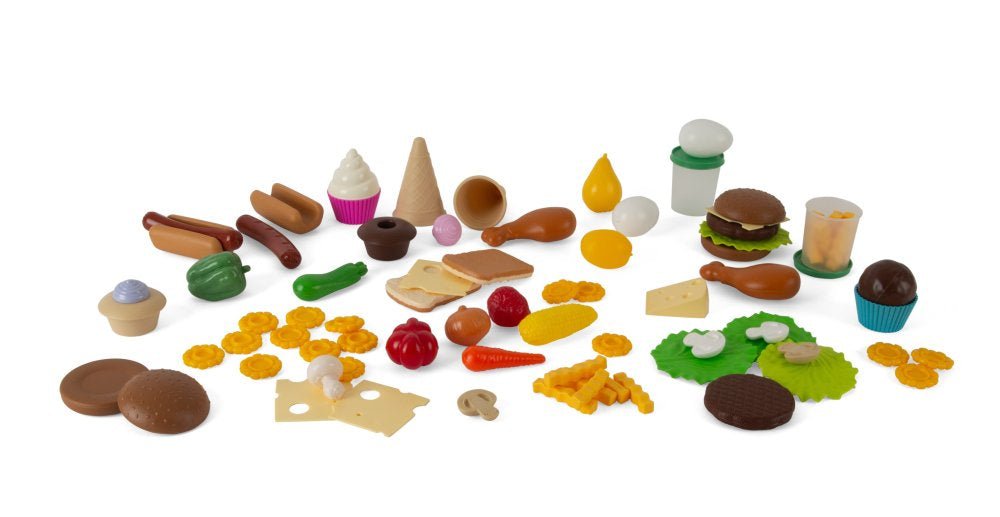 Med dette store sæt legemad kan dit barn sammensætte sin helt egen menu og lege café, restaurant eller picnic. Sættet rummer et bredt udvalg af madvarer, så barnet kan vælge mellem grøntsager, kager, is, burger, toast, bøf og salat – og selv bestemme, hvad der skal på menuen.