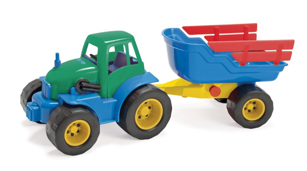 De store og slidstærke hjul gør traktoren nem at manøvrere for små hænder og understøtter udviklingen af både fin- og grovmotorik. Anhængeren kan kobles af og på, hvilket giver variation i legen og styrker hånd-øje-koordinationen gennem gentagende bevægelser.