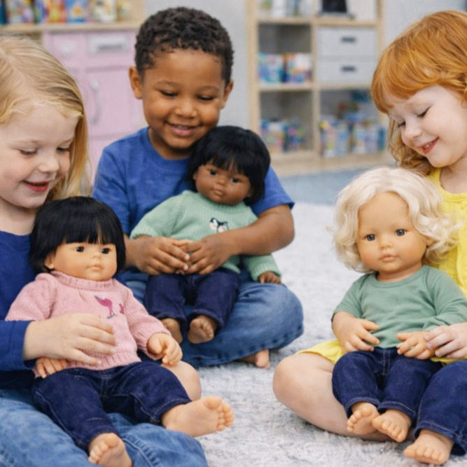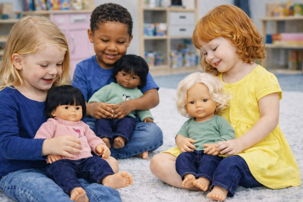 Sættet egner sig godt til institutioner, hvor flere børn skal lege sammen. De tre dukker leveres uden tøj på, men 8 sæt dukketøj medfølger i dette sæt, hvilket giver børnene mulighed for at inddrage påklædning som en del af legen. Mere dukketøj kan tilkøbes separat. Dukkerne passer dukketøj i størrelsen 38-41 cm.
