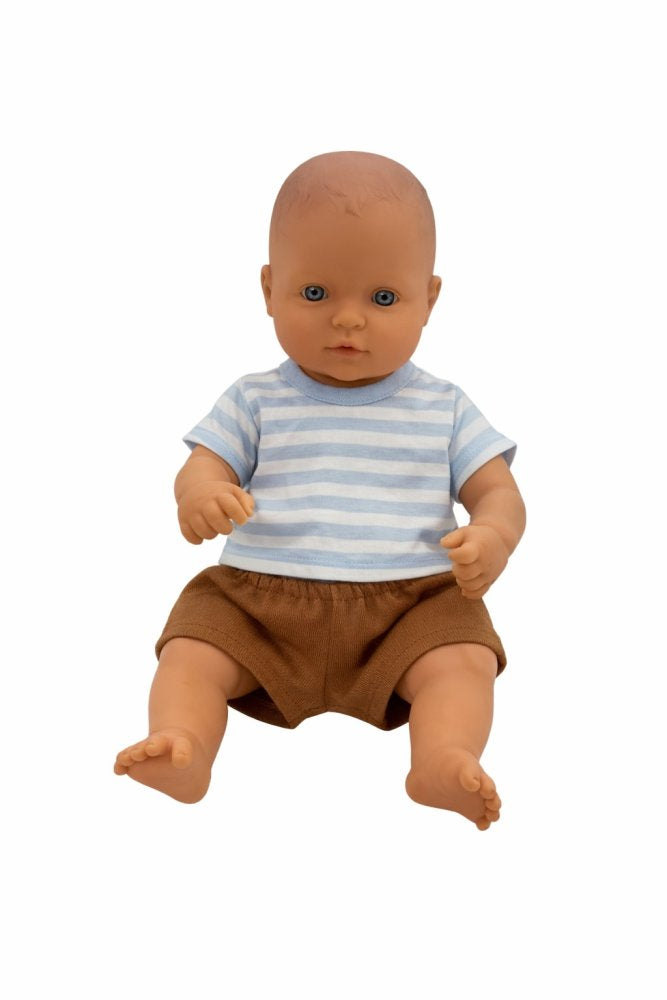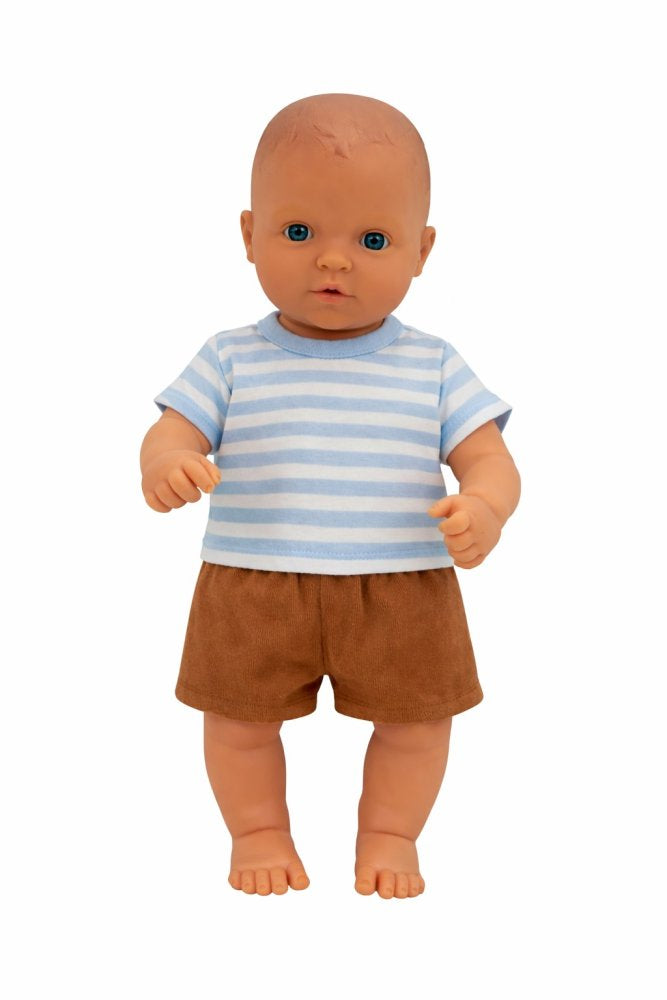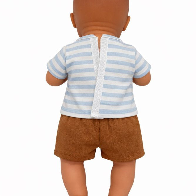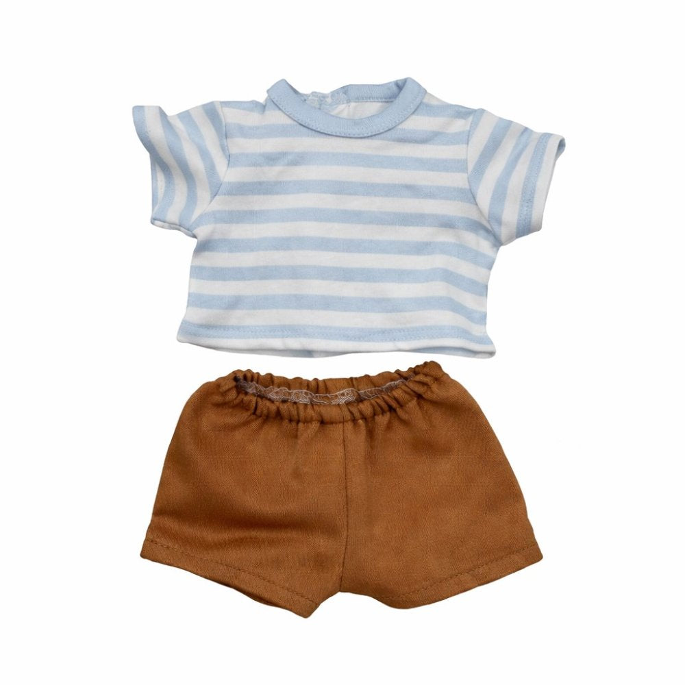 Legebyens dukketøjssæt i størrelse 38-41 cm med brune shorts og en blå og hvidstribet bluse. Blusen har velcro-lukning i ryggen, så det er nemt at påklæde dukken. Serien af dukketøj er designet af Legebyen selv, i en solid kvalitet, der kan holde til rollelegen med dukkerne.