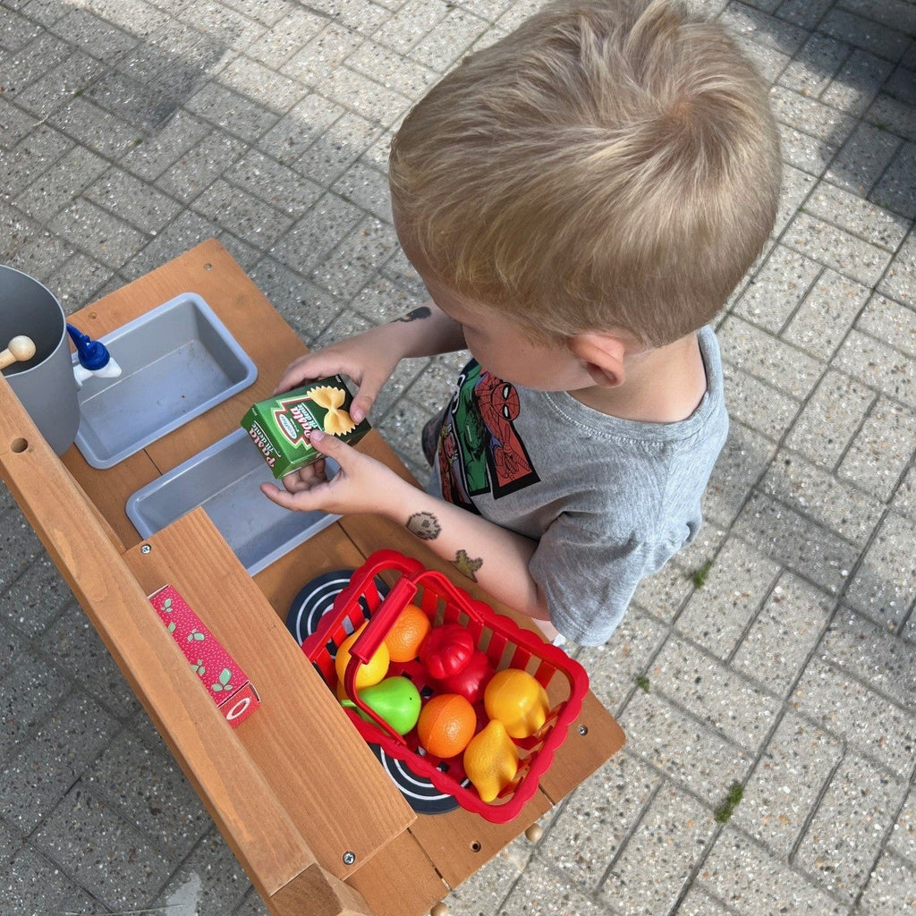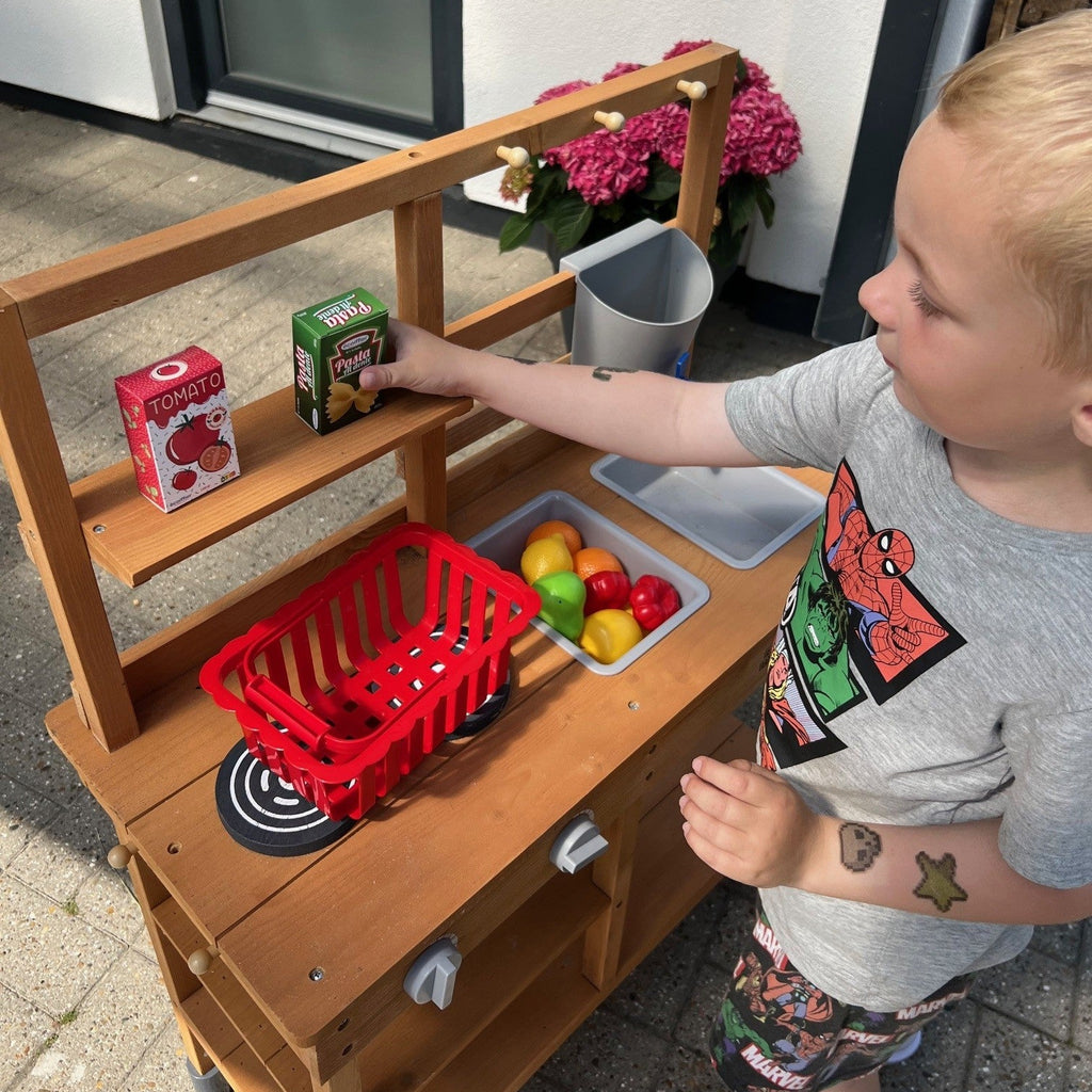 - Træner finmotorik gennem håndtering af madvarer og kurv