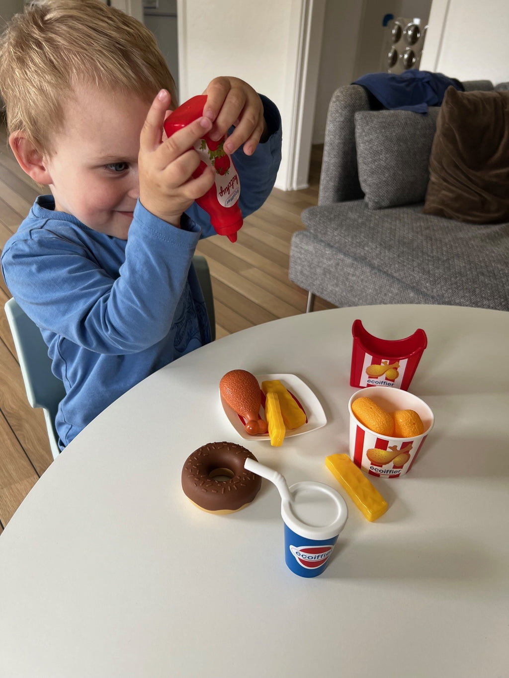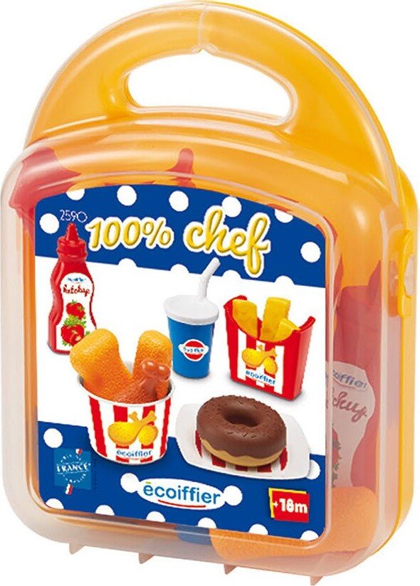 Ecoiffiers Fastfood-sæt med kyllingelår, nuggets, pommesfritter og donut. Sættet indbyder til rolleleg, hvor dit barn kan åbne sin egen lille café eller servere mad for venner eller bamser. Ecoiffiers Fastfood-sæt stimulerer børns fantasi, sociale færdigheder og indbyder til mange timers rollespilsleg. Her styrkes finmotorikken og øje-hånd-koordinationen, når de som tjener eller kunde skal anrette og transportere maden. Fastfood-sættet opfordrer til interaktiv leg, hvor dit barn kan lærer om restaurant besøg, mad og måltidssituationer, farver og former, samtidig med at der øves samarbejde og kommunikation.