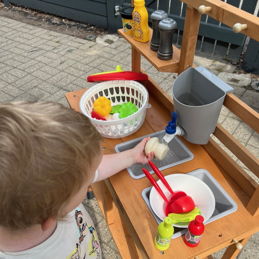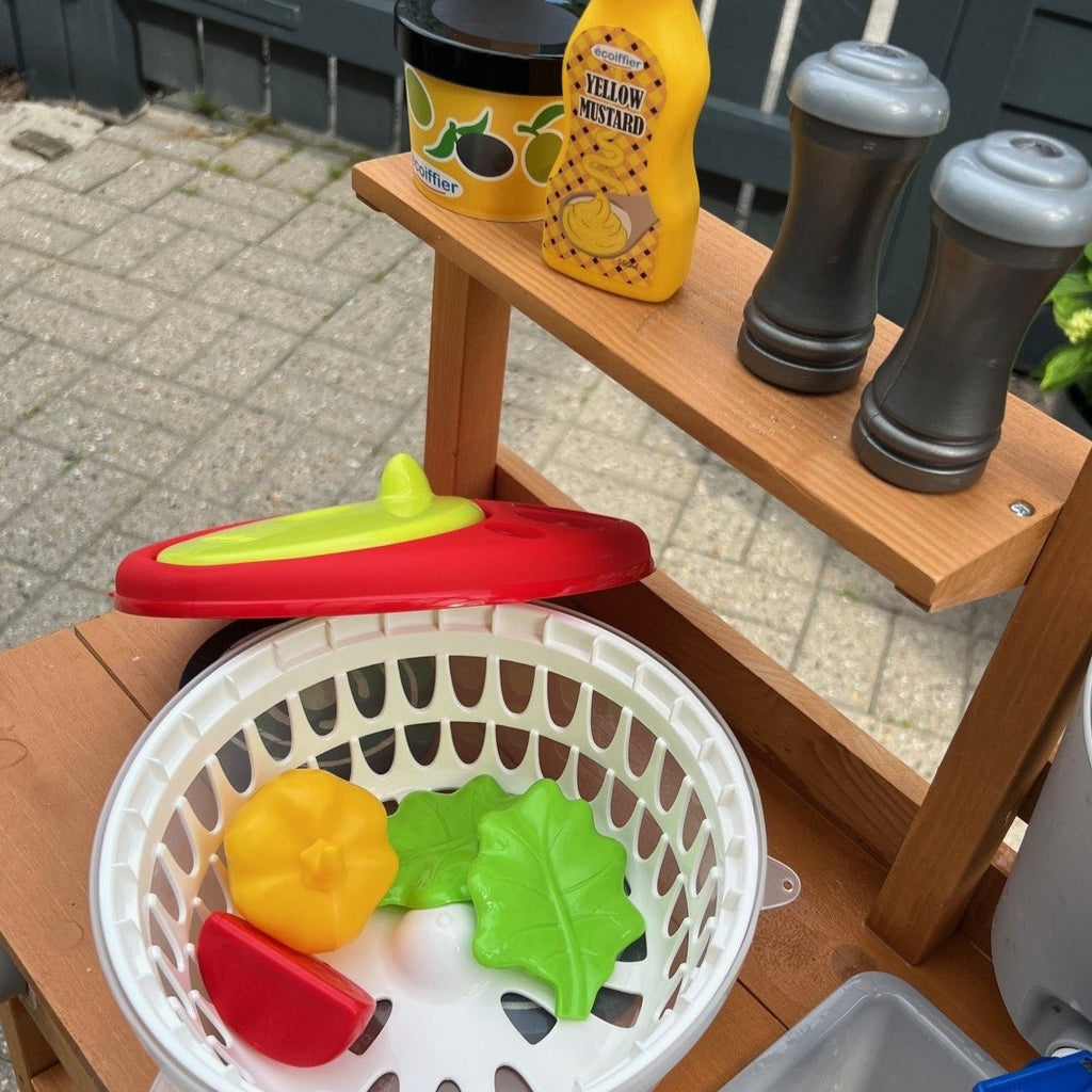 Sættet indeholder alt fra salatslynge, skål, salatblade og grøntsager, til olie og eddike – lige til at lave den perfekte legesalat. Perfekt til børn der elsker at lege restaurant eller kok.