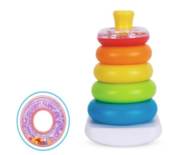 Happy Baby stabeltårnet "Rock-A-Stack Tower" leveres med 5 ringe i forskellige størrelser og farver. Legetøjet er fremstillet af plast. Barnet skal stable ringene på den ustabile fod, som vipper frem og tilbage og som gør det sværere at stable tårnet. Og for at gøre det ekstra underholdende for de små, har ringene forskellige farver og den mindste har perler indeni, som bevæger sig rundt , når barnet ryster den. Legetøjet er med til at udvikle barnets finmotorik, hånd-øje koordination og tålmodighed.