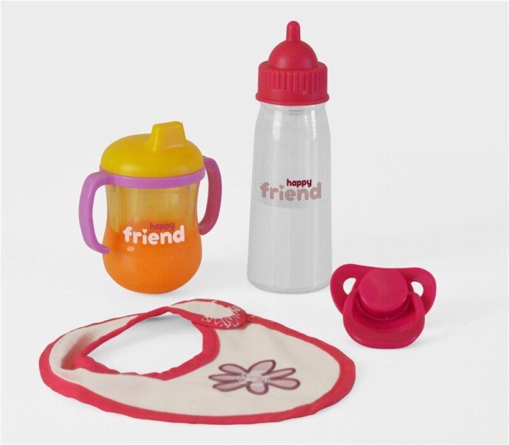 Happy Friend Sutteflaske sæt giver barnet mulighed for at gøre spisetid til en hyggelig del af dukkelegen. Med sutteflaske, kop, sut og hagesmæk kan barnet passe dukkerne, som var det i virkeligheden. Når barnet leger måltidstid, bliver det både genkendeligt og trygt at efterligne hverdagens rutiner. Legen styrker empati og fantasi, mens barnet får lov til at udtrykke omsorg på sin egen måde. Happy Friend – Sutteflaske sæt er en del af Legebyens udvalg af dukketilbehør, der gør rollelegen levende.