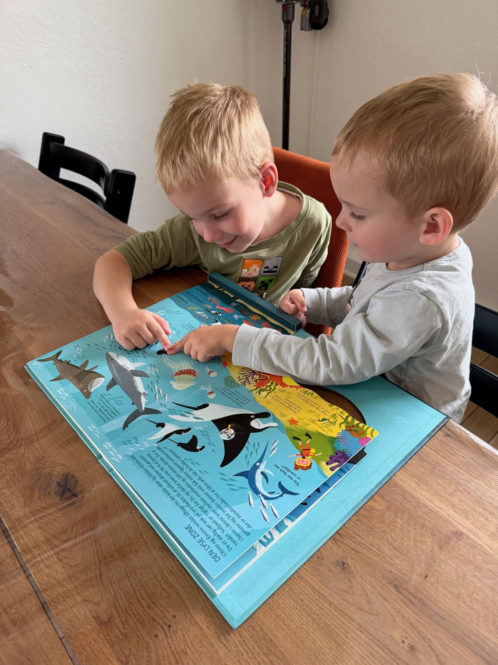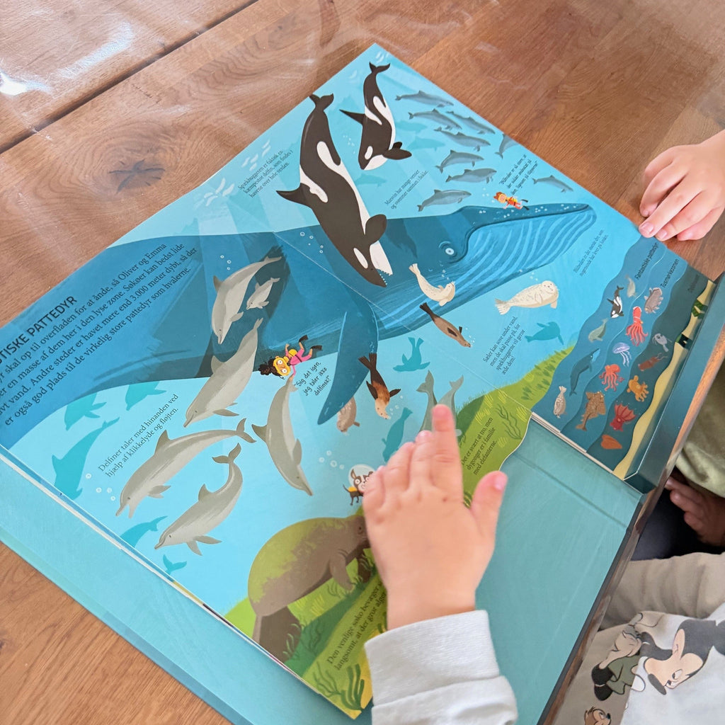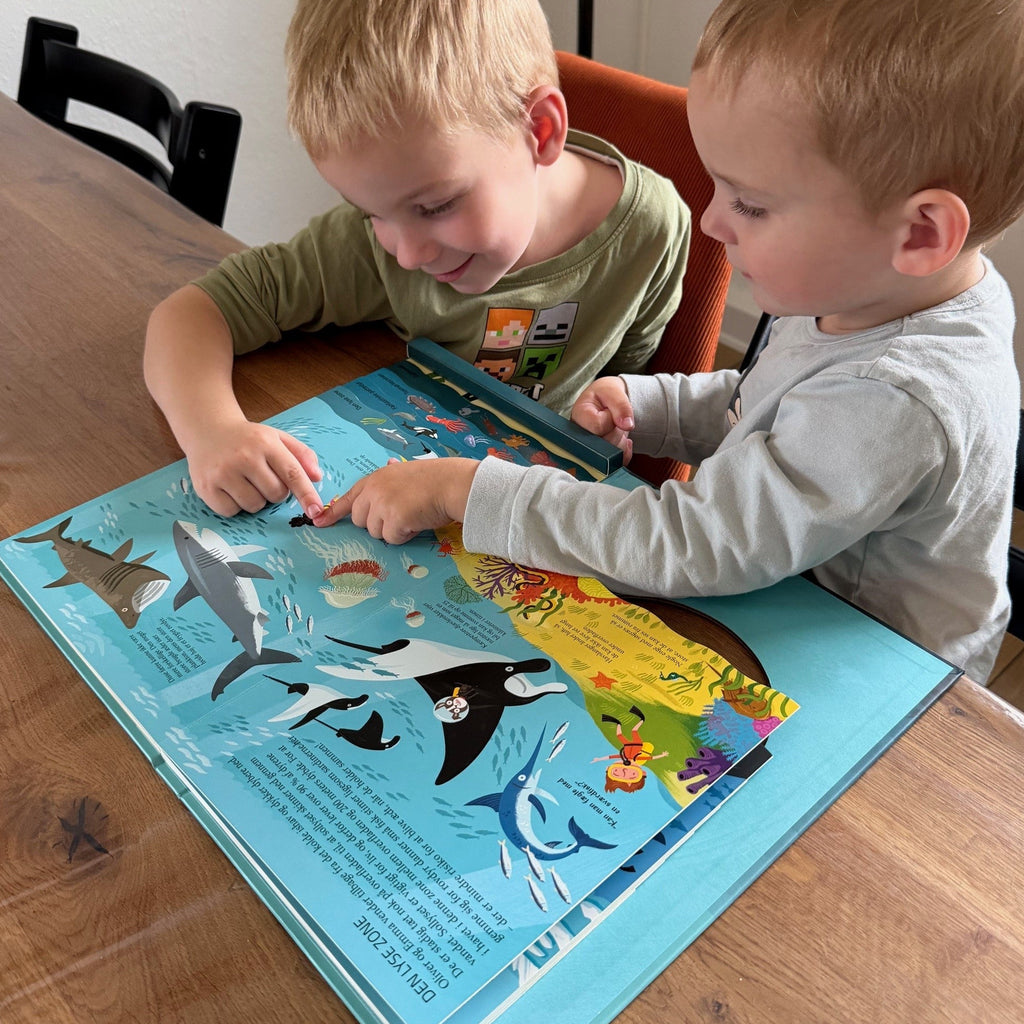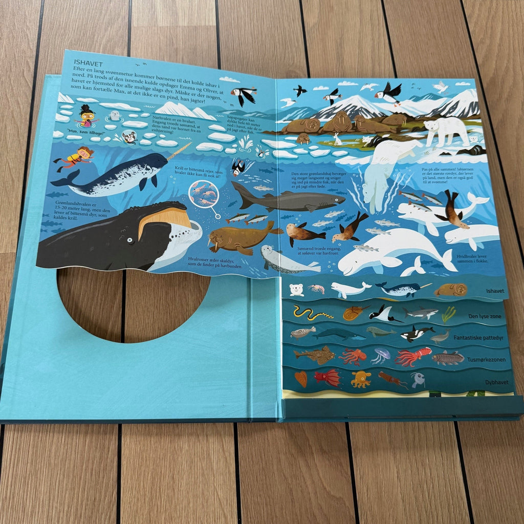 Kom med på en dykkertur i havet. Dyk ned under havets overflade og mød de fantastiske dyr, der lever der! Læs og lær om alle de spændende havdyr - fra små krabber i tidevandspytter ved kysten til mærkelige væsner i det mørke dybhav. Svøm tusinde af kilometer under havet! Bogen har en søg-og-find opgave på hvert lag.