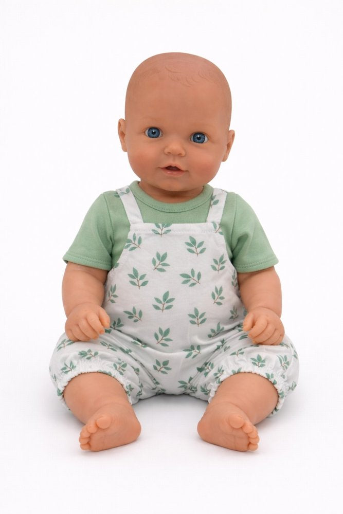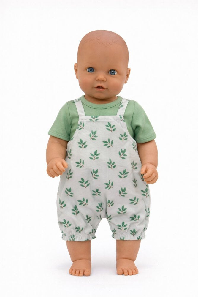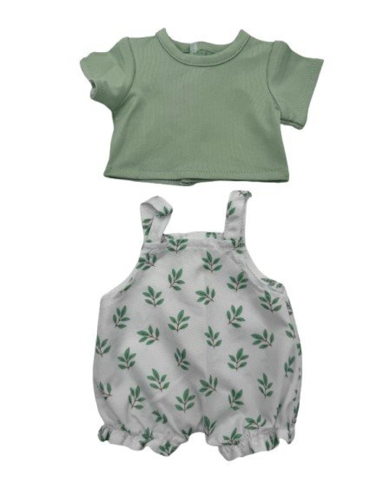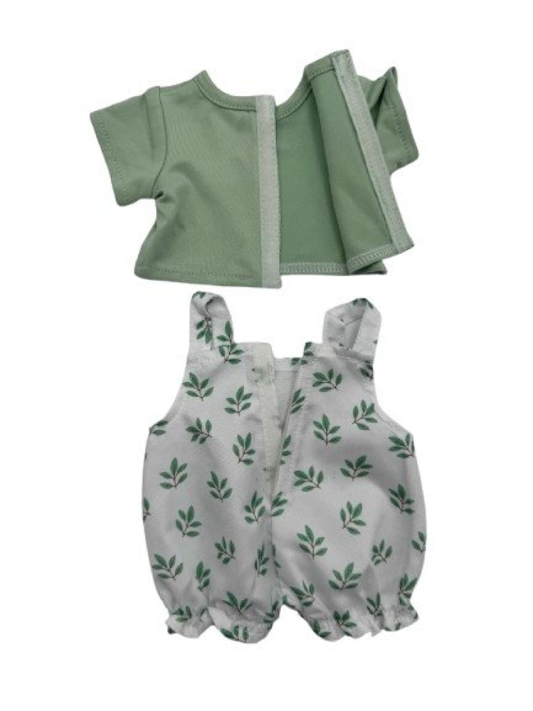 Legebyens 2-delt sæt. Sæt med t-shirt og buksedragt, hvilket gør det enkelt for børn helt ned i vuggestuealderen at at give dukken tøj på. Serien af dukketøj er designet af Legebyen selv, i en solid kvalitet, der kan holde til rollelegen med dukkerne.