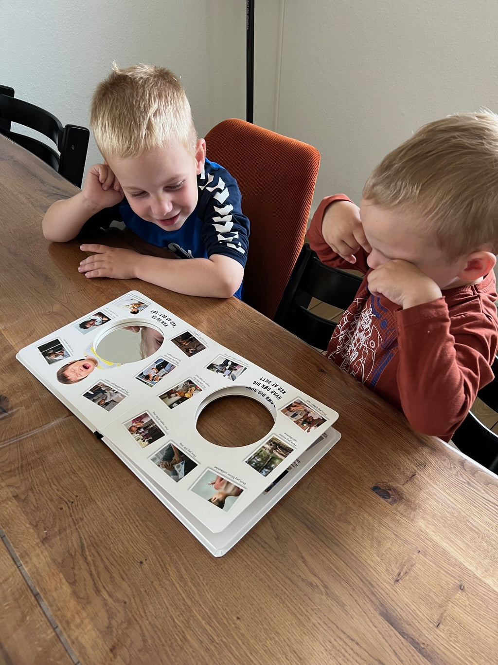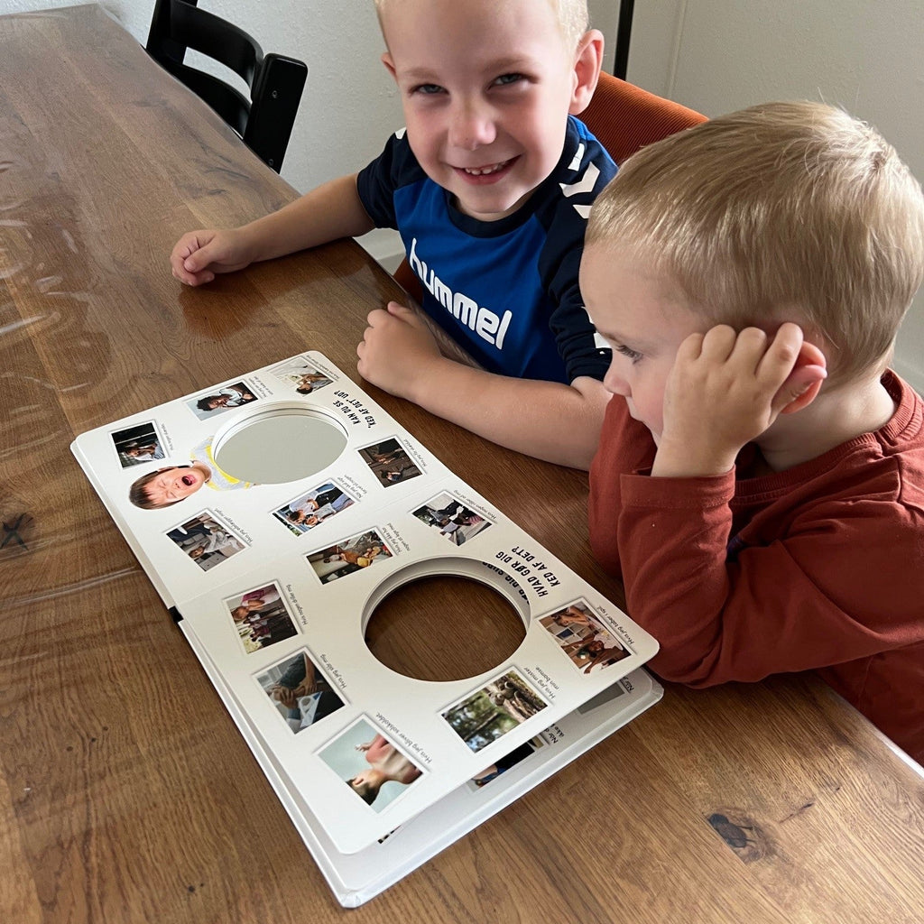 Bogen indeholder et spejl i splintfri plast, som barnet kan spejle sit ansigt i under læsningen.