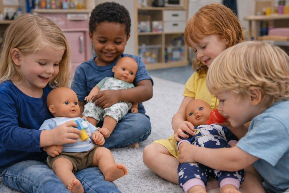 🧒 Tidlig interesse (12–24 måneder) Omkring 12 måneder kan børn begynde at vise interesse for dukker, ofte ved at røre ved dem, bære dem rundt og måske efterligne enkelte handlinger som at give dukken mad eller kram. I denne alder er legen meget enkel og primært imiterende (“symbolsk leg” i sin spæde start).