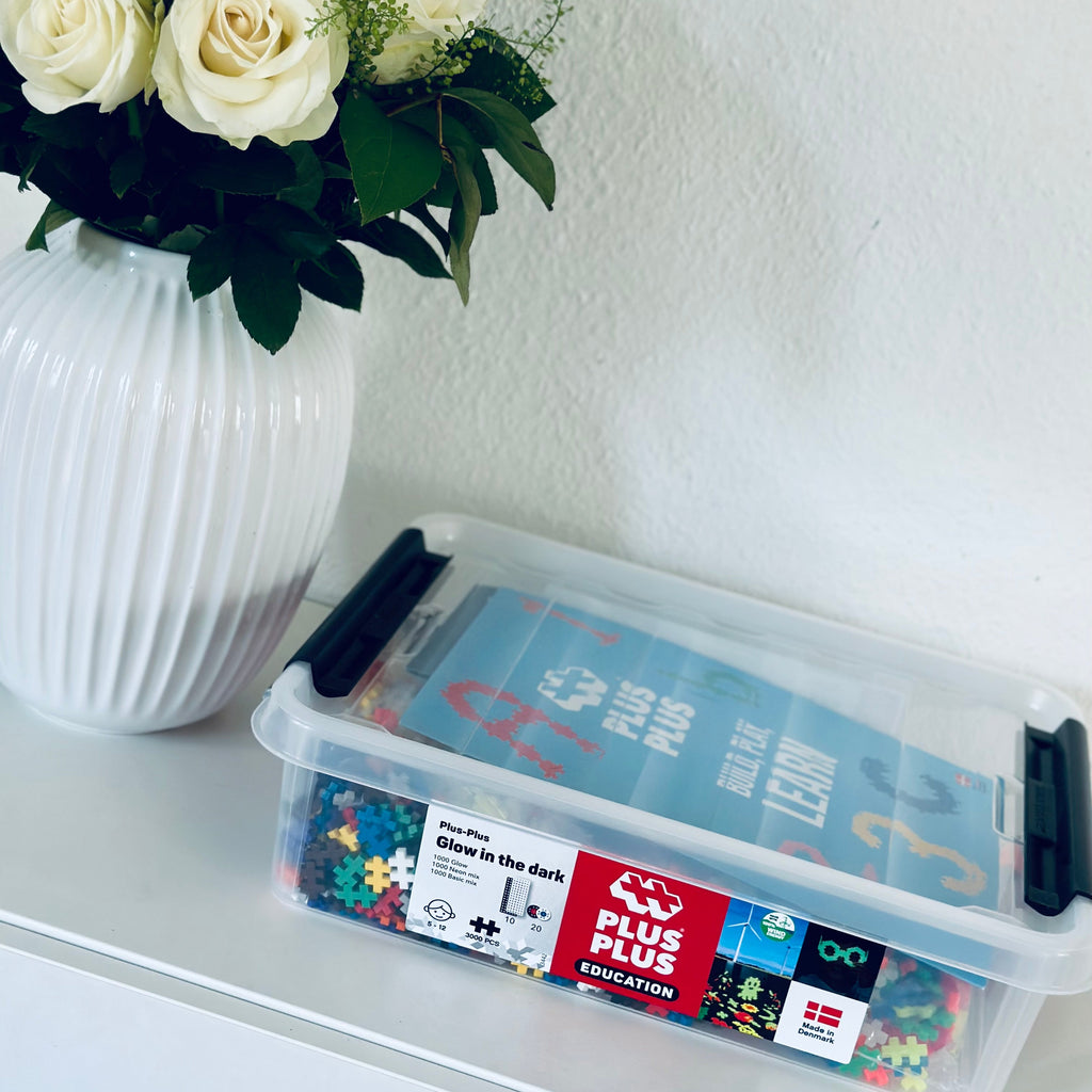 Her får du en fin plast opbevaringskasse fyldt med 3000 Plus Plus brikker, hvoraf de 1000 lyser i mørke. I kassen er der også et idéhæftet fyldt med sjove idéer til hvad du kan bygge, 5 sorte og 5 hvide byggeplader samt 20 hjul. Et fantastisk sætte med masser af muligheder til konstruktionsleg og byggerier.