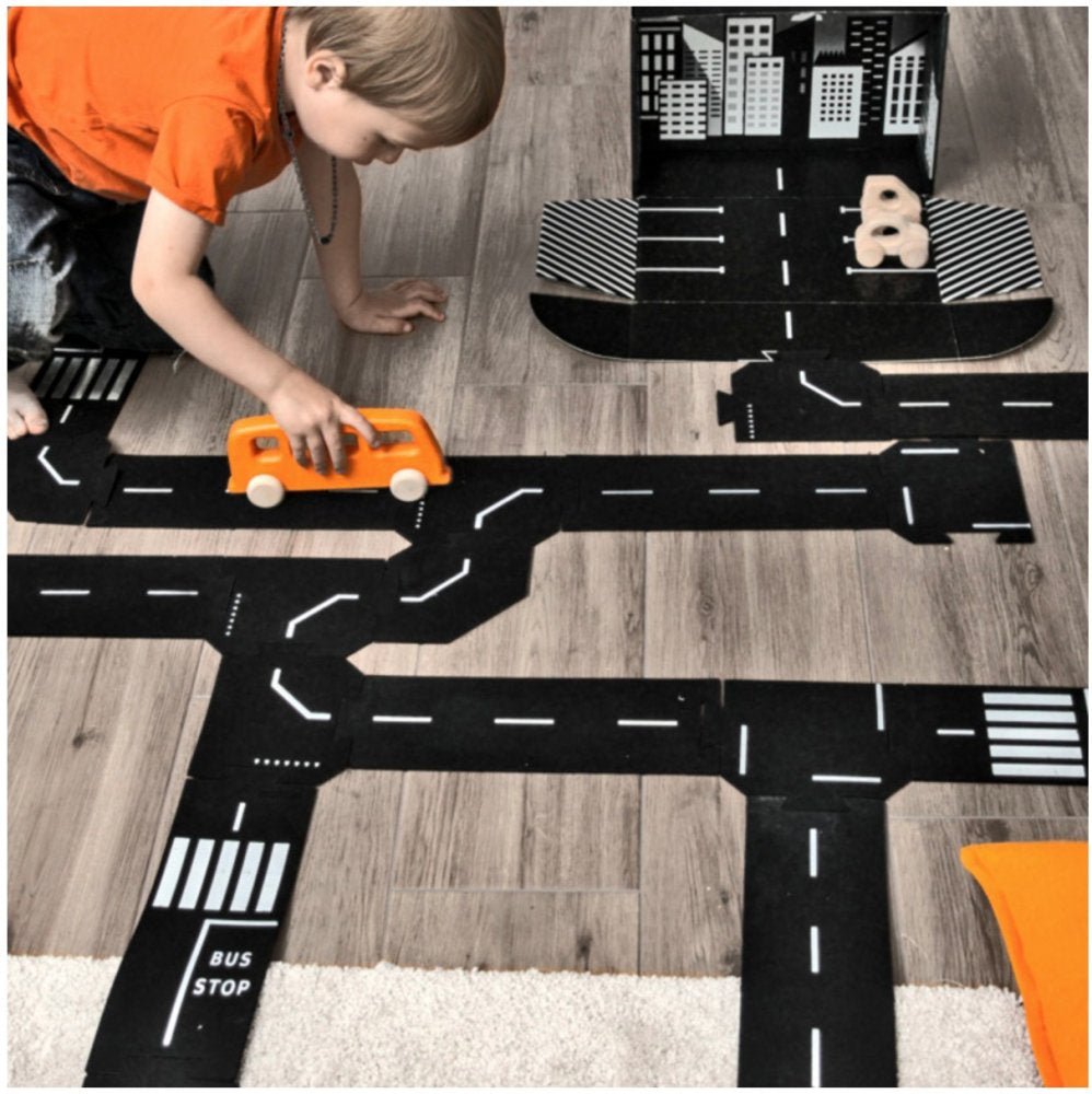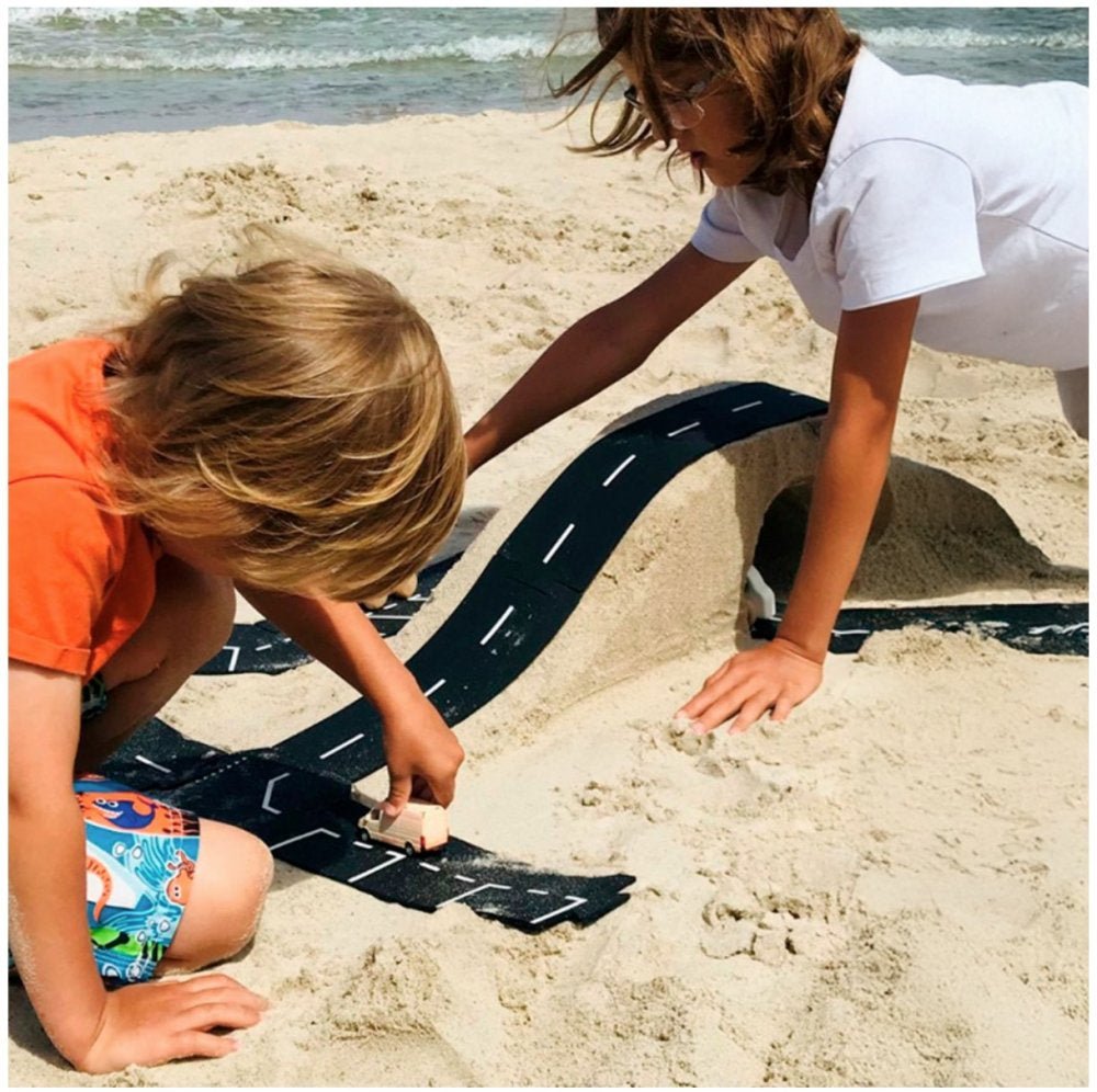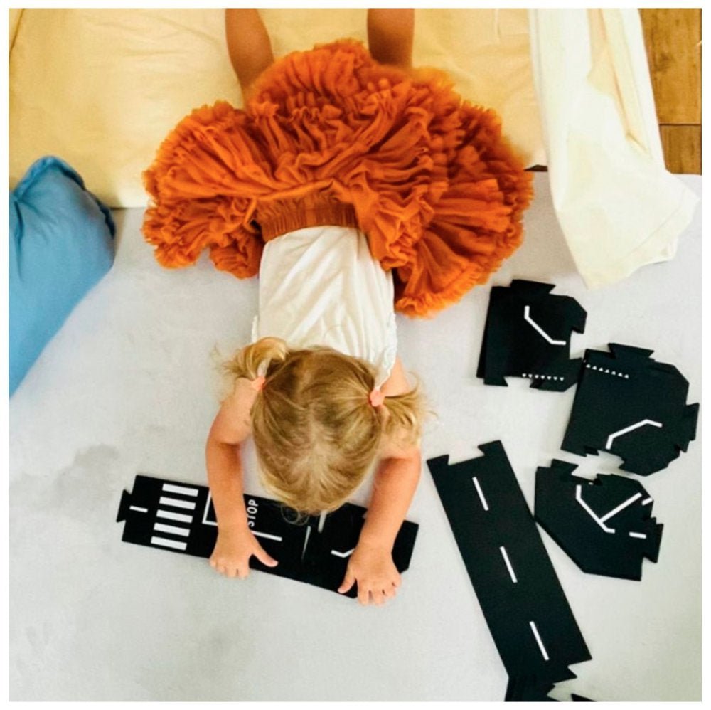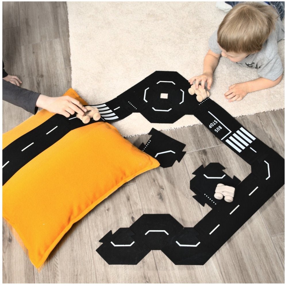 ToddleRoad er fleksible bilbaner i fødevaregodkendt silikone. Vejbane-delene kan klikkes sammen ligesom et puslespil.Det er skabt til at holde til daglig leg i både hjem og institution. De bløde vejbane-stykker kan lægges på både gulvtæpper, puder og små niveauforskelle, så børn kan bygge kreative vejforløb, der passer til omgivelserne.