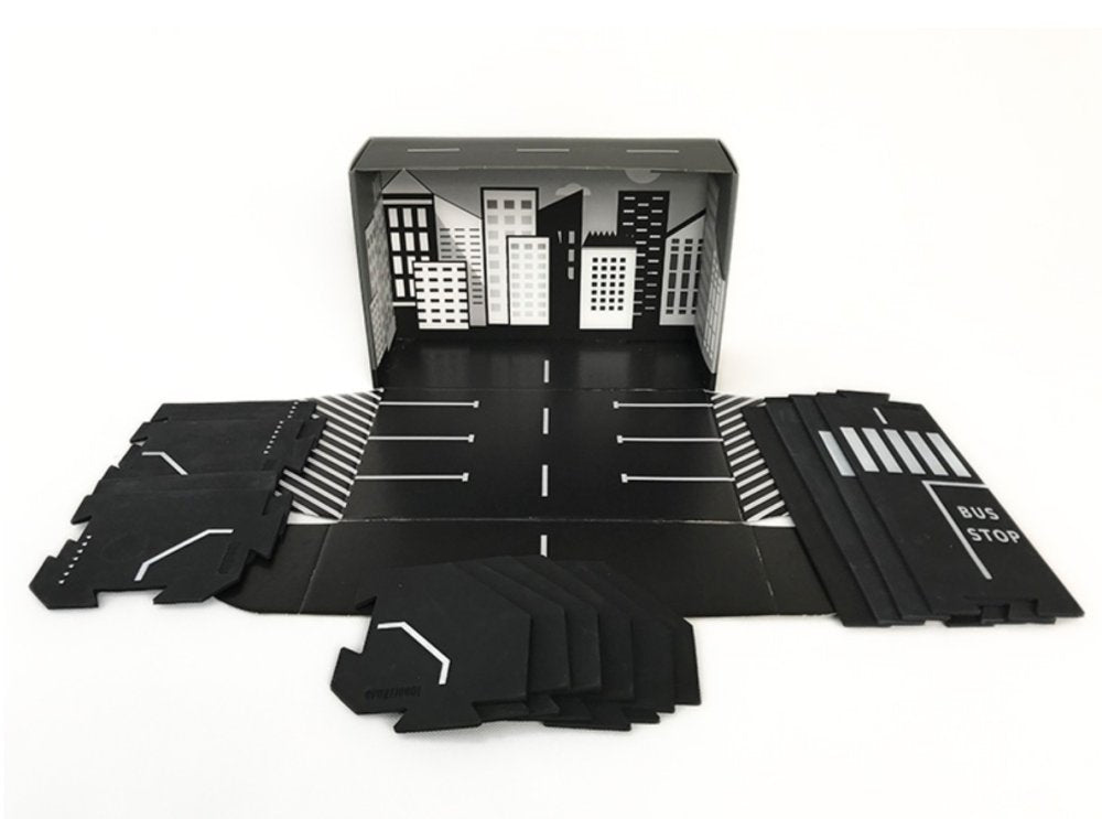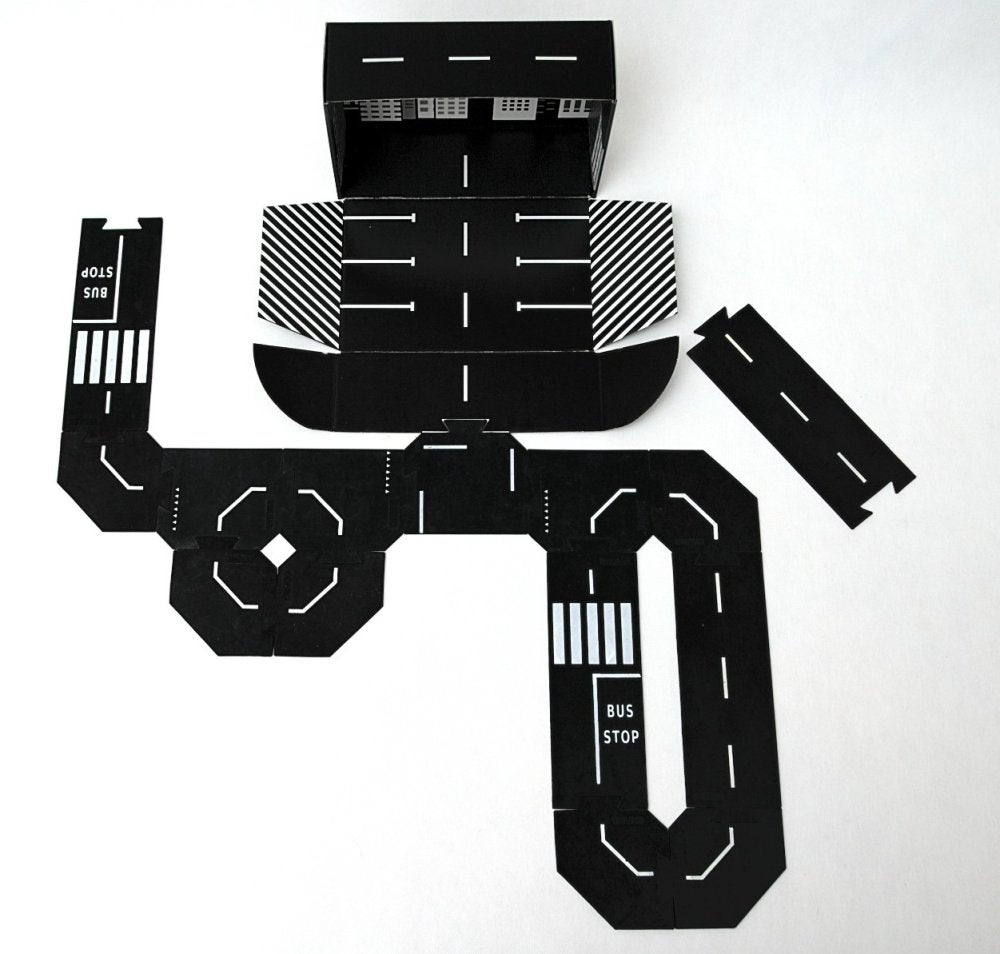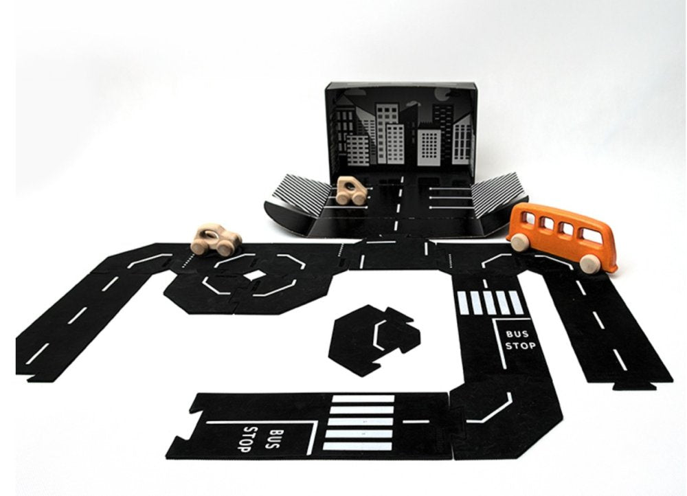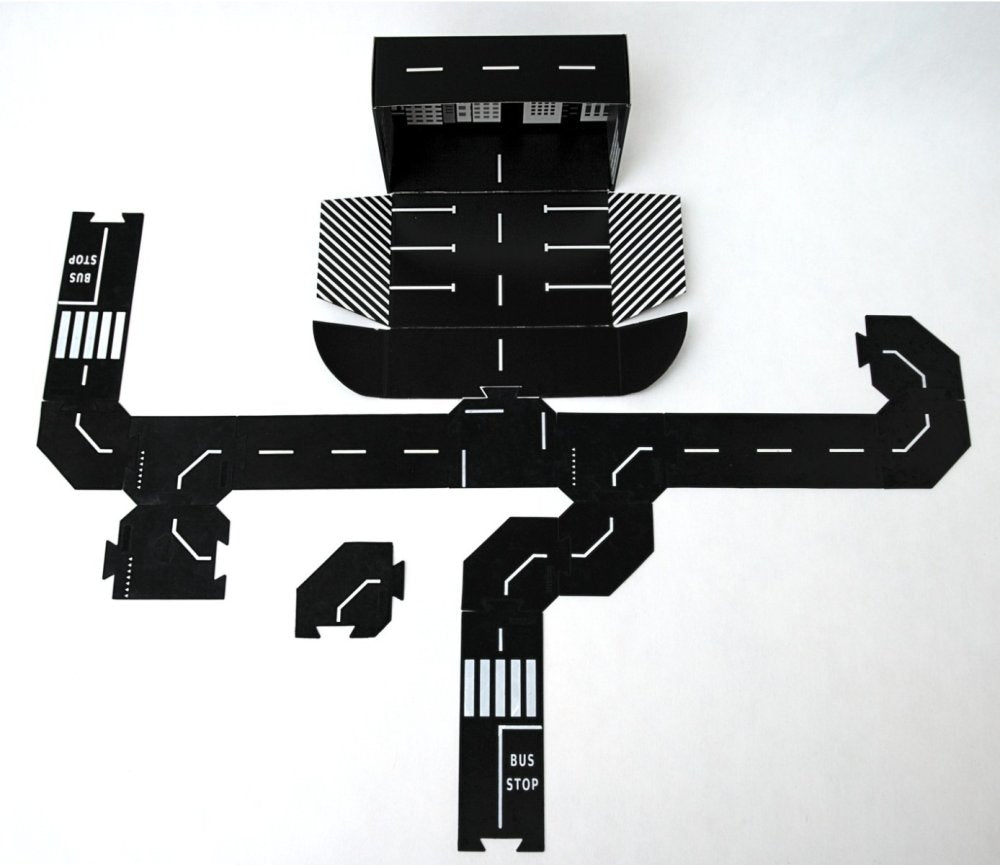 Sættet STORE sæt indeholder tæt på 6 meter vej fordelt på både lige stykker, sving og kryds. Emballagen er designet med print indvendigt, så den kan bruges som parkeringshus og blive en naturlig del af legen. Vejbanerne er nemme at holde rene, da de tåler opvaskemaskine, og den sorte farve gør det let at se, når de trænger til en vask.