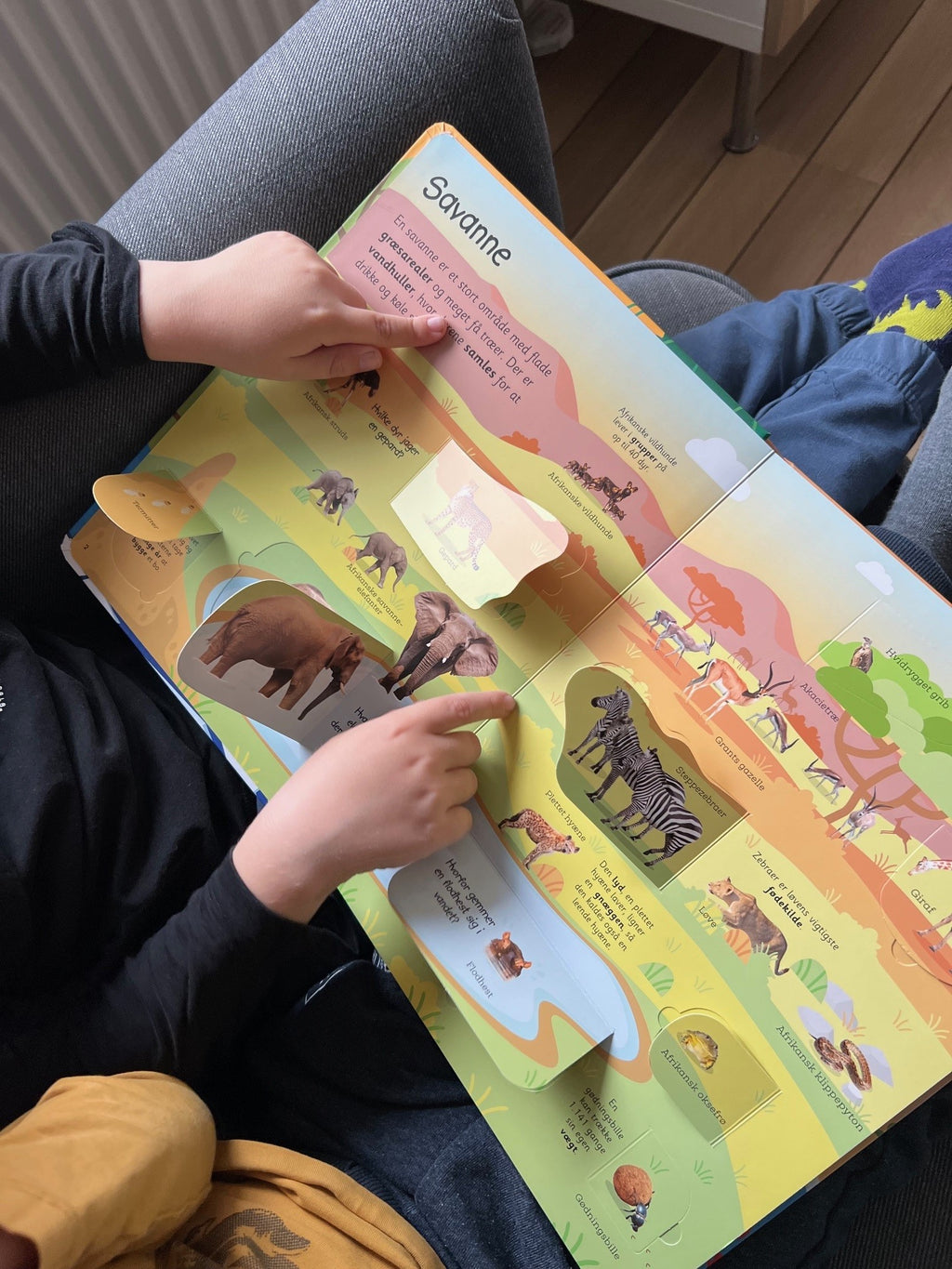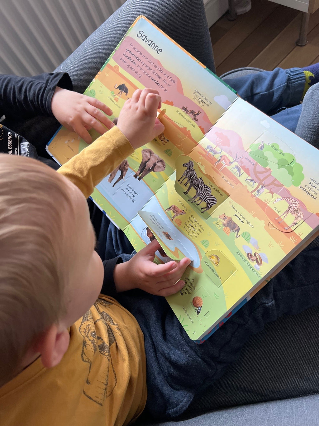 "En underholdende og lærerig børnebog med flapper. De flotte farverige illustrationer fangede straks opmærksomheden hos børnene. Stil børnene spørgsmål og tal om hvad der ses i bogen og åben derefter de tykke flapper. En bog der inviterer til gode snakke, hvilket er perfekt for, at kunne udvikle ordforråd, opmærksomhed og interesse..."