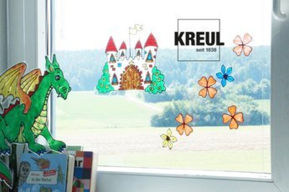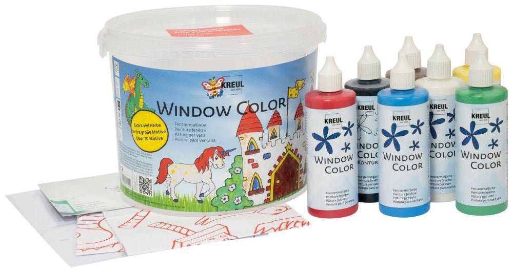 Med Kreul Window Color Knight Powerpack kan man skabe imponerende vinduesmotiver fyldt med riddere, slotte, våbenskjolde og middelalderstemning. Sættet indeholder flasker med klare farver, sort konturfarve og over 70 designskabeloner, så der er rig mulighed for at lave mange forskellige motiver.